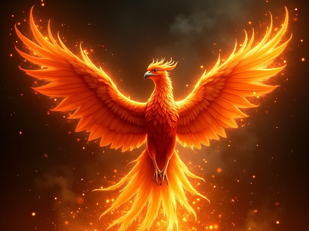 Una fenice maestosa che risorge dalle fiamme — piume di fuoco rosso, arancione e oro. Il simbolo della rinascita e della forza interiore in un diamond painting di grande impatto visivo.